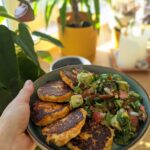 Lisandiks sai minul täna avokaadost, tomatist, jalapenost, koriandrist ja sibulast salat ohtra laimimahlaga, mis sobis lausa suurepäraselt. Kuna kodujuust ise on valgurohke ning kasutusel on ka jahu, siis toekamaid lisandeid ma siia ei pakukski, aga kindlasti sobivad nende kotlettide juurde ka paljud teised salatid.